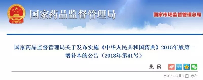 7月5日,國(guó)家藥監(jiān)局發(fā)布通告,《中華人民共和國(guó)藥典》2015年版第一增補(bǔ)本已編制完成。此增補(bǔ)本自2019年1月1日起施行。